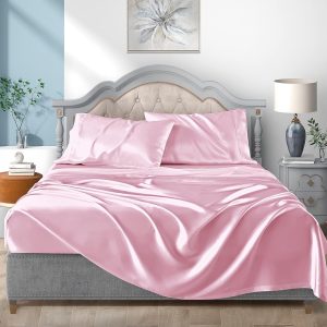- Luxury Bedding Set- Luxury 4pc Queen Size SatinSheets Sets- 1 flat sheet 90″x102″, 1 fitted sheet 60″x80″x14″, 2 pillowcases 20″x30″. Deep pockets that fit mattresses up to 14″ deep with elastic around the fitted sheet. These bed sheets grip and fit better than any other sheet set! With added stretch and durable elastic the fitted sheet is designed to stay snug and fitted to your mattress.