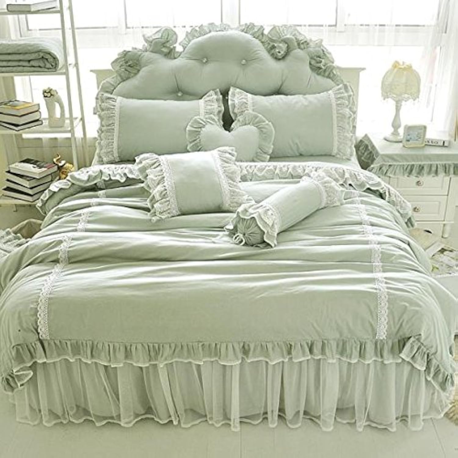 Shabby Ruffle Duvet Cover Set Twin Cotton Chic Wrinkle Girls Bedding Green 4 Piece Romantic Lace Design Bed Skirt